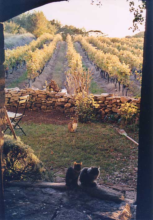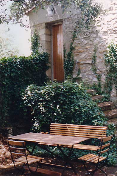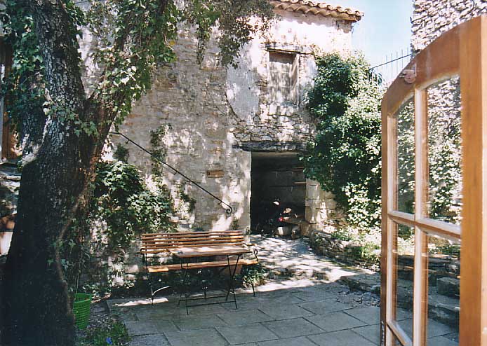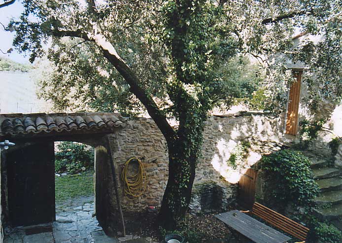 Der Innenhof mit schattenspendender Steineiche und Steintreppe